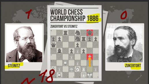 Красавцы-слоны Вильгельма Стейница и мат "поцелуй смерти" бойким ферзём Цукерторту в партии №18 исторического матча 1886 г. в Новом Орлеане
