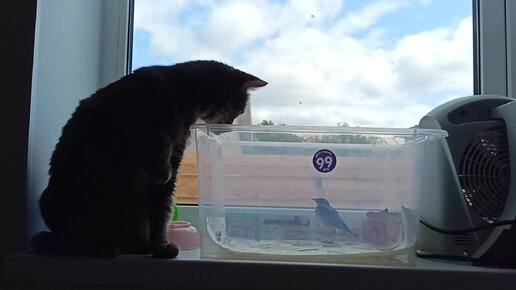 Кошка знакомится с подобранным птенцом