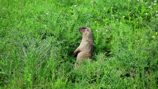 Степной сурок кормится у своей норы цветочками. Нижегородская область