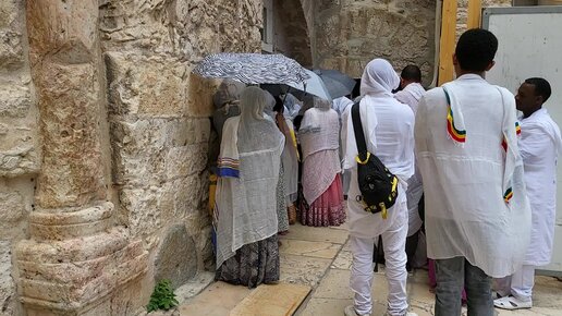 Дорогие друзья! Я покажу вам верующих эфиопов у входа в церковь. Сама церковь полностью заполнена молящимися. Все в белом и босиком.
