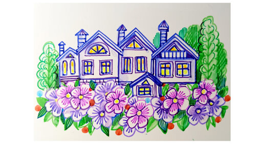 🏘🏡🏠Как нарисовать домики в цветах фломастерами (маркерами). 🌺🏠🌸