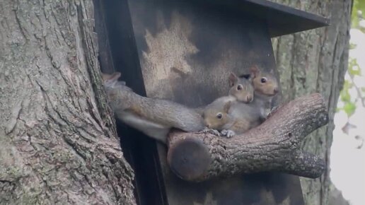 Необычайно хорошенькое семейство белок с бельчатами поселилось в скворечнике, в тесноте, да не в обиде