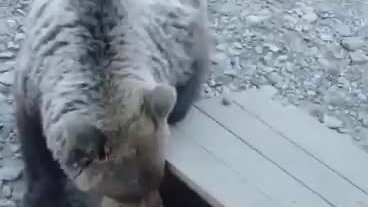 Собаки отбивают щенков от медведя.