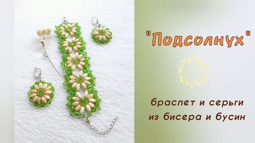 «Подсолнух». Летние украшения. Браслет и серьги из бисера и бусин.