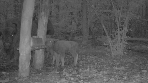 Ми-ми-мишные видеокадры запечатлела фотоловушка на заповедной территории. Зубры-мамы привели к кормушке своих новорожденных малышей.