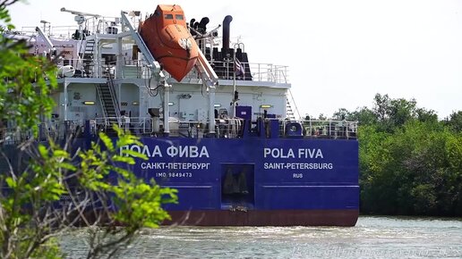 Теплоход ПОЛА ФИВА идет по каналу 104 ВДСК в сторону Волги