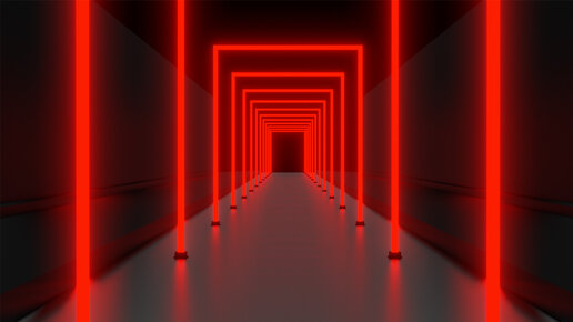 Неоновый туннель из квадратных красных рамок на черном фоне. Цикличное видео. Футаж