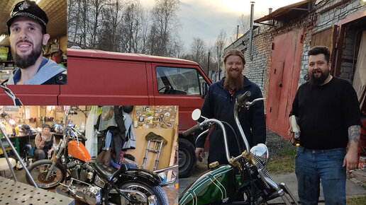 Паша Кот и его олдскульный Softail в мастерской Alkothrashers Garage! Диванный критик MrChening в деле)