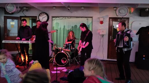 На солнечной палубе теплохода звучит песня "Желаю" из репертуара Ваенги в исполнении Ксении Павроз и кавера "Фурманов" Павел Сивков (баян)
