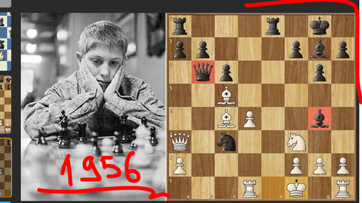Роберт Фишер, в весьма юном возрасте, просто взял и проиграл черными партию Артуру Бисгвайеру в Нью-Йорке, 1956. Мат в доигрывании покажу