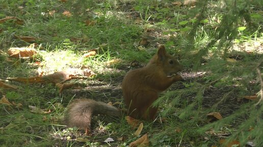 Борьба белок за орехи - с голубями и между собой. Удалось снять крупным планом, как белка лакомится орехом