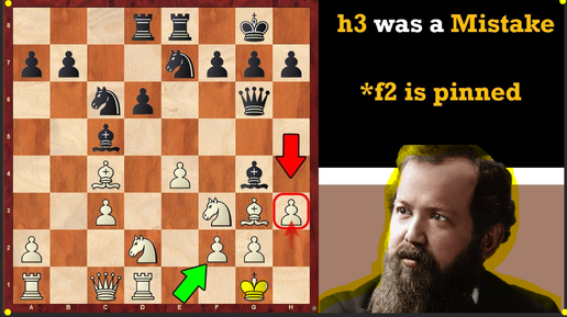 Стейниц (черные) ловит Чигорина на детском зевке и в простом, непринужденном стиле обыгрывает (Гавана, 1889, партия №5 великого матча за 👑)