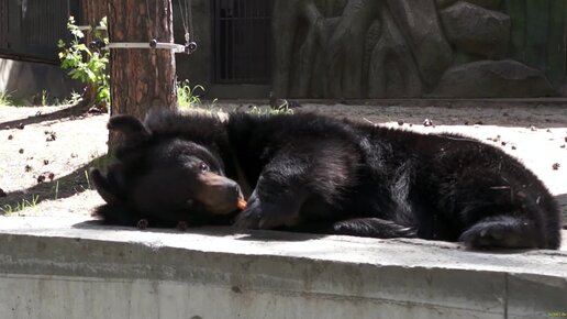 Гималайский медведь лениво кушает, забавно чешется, сладко зевает и засыпает под любимую музыку из мультфильмов
