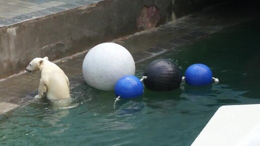 Медвежата мамы Герды плавают, ныряют, играют с шарами и желтым ведерком.