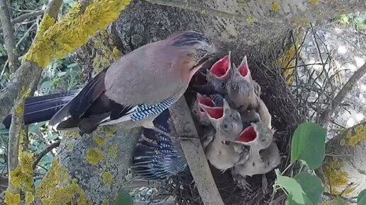 ГНЕЗДО СОЙКИ. Сойка кормит птенцов