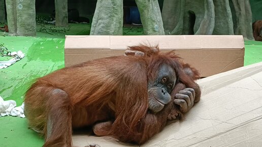 Суматранские орангутаны Чава и Алиса играют на картоне в Московском зоопарке.