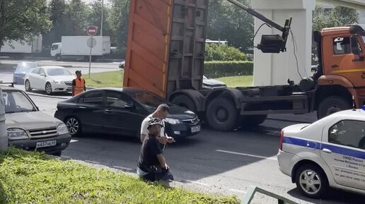 Грузовик зацепил кузовом пешеходный мост в Зеленограде