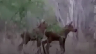 Лосиха бесстрашно защищает своих детёнышей от медведя