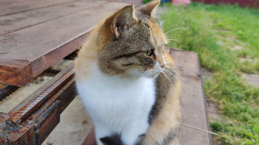 Приехали на дачу, а бездомная кошка уже встречает на участке, ласкается, трется и просит чтобы ее покормили. Машка радуется нашему приезду