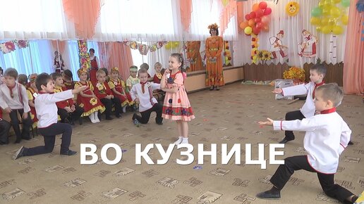 Бравые молодые кузнецы и озорная Дуняша инсценируют русскую народную песню в современной обработке на осенних посиделках в детском саду