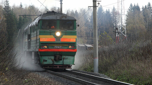 Тепловоз 2ТЭ116-177 на подъёме с грузовым поездом. Перегон Благовещенское - Шаховская Московской железной дороги. Октябрь 2016 года.