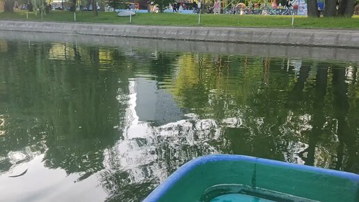 На лодке с вëслами по Фестивальным прудам в московском парке дружбы, район речного вокзала летом