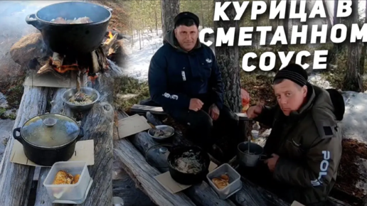 Курица в сметанном соусе в казане на костре