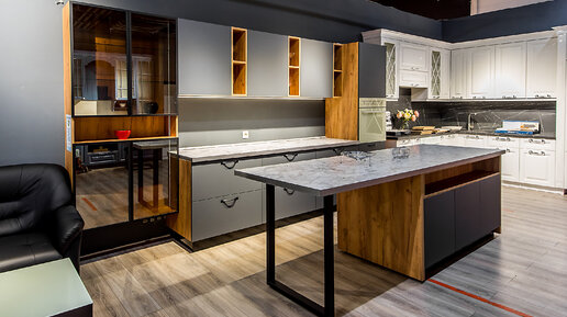 Современная износостойкая кухня с супер-матовыми фасадами из пластика c эффектом софт тач. Витрина с боковой подсветкой.