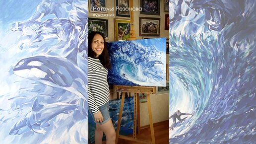 СЕРФИНГ В ИСКУССТВЕ ! Видео описание картины "Покоритель волн" холст, акрил, 80-60 см // художник Наталья Резанова