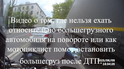 Видео о том, где нельзя ехать относительно большегрузного автомобиля на повороте или как мотоциклист помог остановить большегруз после ДТП.