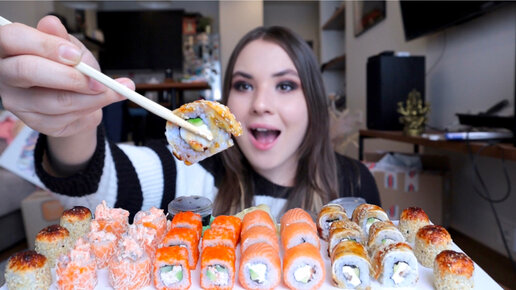 МУКБАНГ последнее видео в… БОЮСЬ СТАРОСТИ тест новой доставки сет роллов с лососем и угрем mukbang