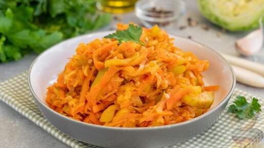 Вкусное домашнее блюдо без мяса. Молодая капуста, тушенная с кабачками.