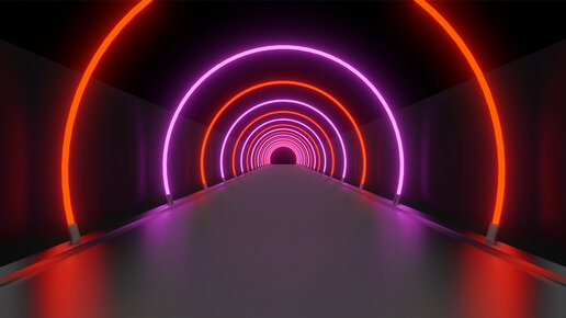 Туннель из неоновых красных и фиолетовых колец на отражающем фоне. Цикличное видео. Футаж