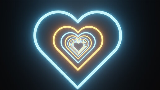Неоновый желто-голубой туннель в форме сердца на черном фоне. Цикличное видео. Футаж