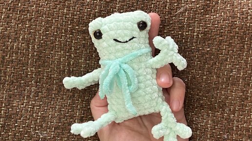 Мастер класс по вязанию лягушки из плюшевой пряжи с длинными лапками без пришивания деталей, глазки вставные с фиксаторами, рот вышит нитью.
