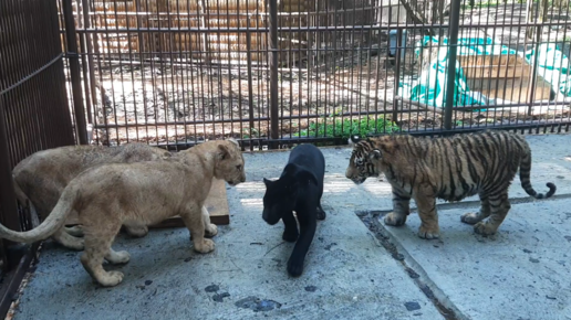 Встреча чёрного ягуара Багиры с тигрятами и львятами в Подмосковном Сафари-парке