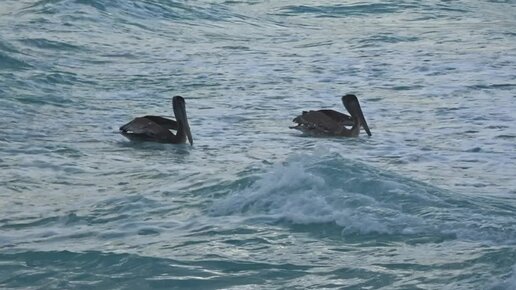 Пеликаны купаются в океане, а дети чаек носятся по песку