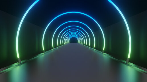 Неоновый спектральный туннель из зелено-голубых круглых арок на темном фоне. Цикличное видео. Футаж