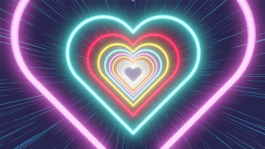 Неоновый туннель из разноцветных сердечек на темном фоне в полоску. Цикличное видео. Футаж