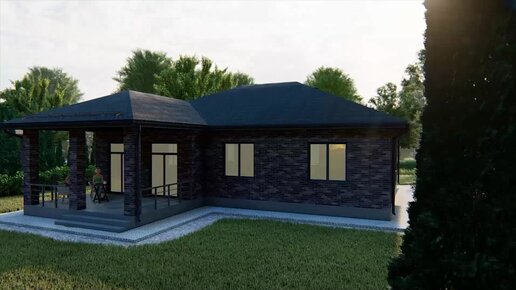 Видеообзор проекта одноэтажного дома площадью 130кв.м. с навесом для автомобиля на 45кв.м.