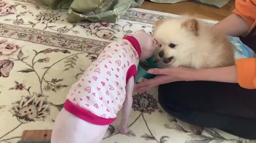 Песику Миколе помогают покушать 2-е: Рита и кот Инка