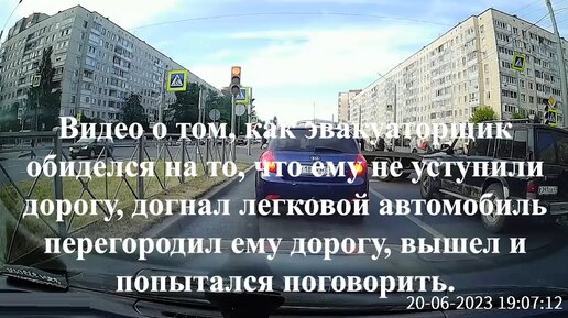 Видео о том, как эвакуаторщик обиделся на то, что ему не уступили дорогу, догнал авто перегородил ему дорогу, вышел и попытался поговорить.