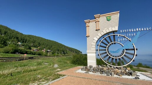 Вид на начало кругобайкалки, монумент КБЖД, озеро Байкал и поезда, поднимающиеся в гору от побережья в сторону Иркустка. Путешествие по кругобайкальской железной дороге (КБЖД). Часть 2