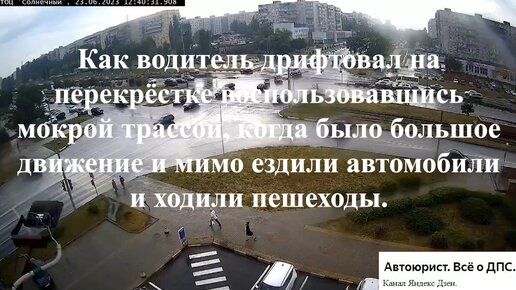 Как водитель крутил пятаки на перекрёстке воспользовавшись мокрой дорогой, хотя было большое движение и мимо ездили авто и ходили пешеходы.