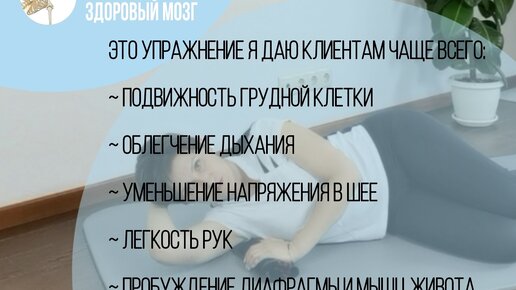 Это упражнение даю чаще всего: подвижность грудной клетки, дыхание, уменьшение напряжения в шее, лёгкость рук, пробуждение мышц живота