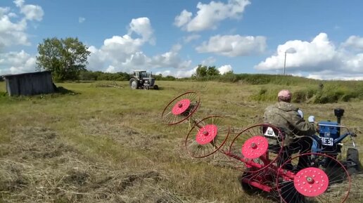 Мотоблок Скаут с граблями Солнышко. Сметали два стожка.