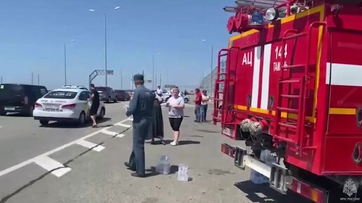 Сотрудники МЧС России раздают воду автомобилистам, застрявшим в пробке в районе Крымского моста
