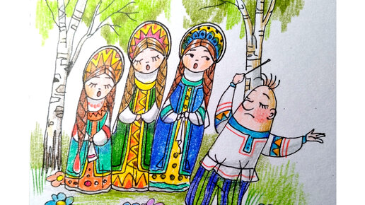😮😯😲Поющие девушки. Рисунок маркером (фломастером) и цветными карандашами.