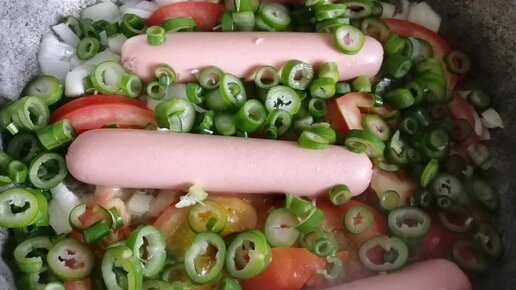 Завтрак рабочее крестьянский. Омлет с сосисками, зелёным луком и помидорами. Салат в ролик не попал