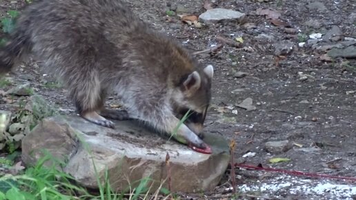 Енот наелся! Покормили отдыхающие.